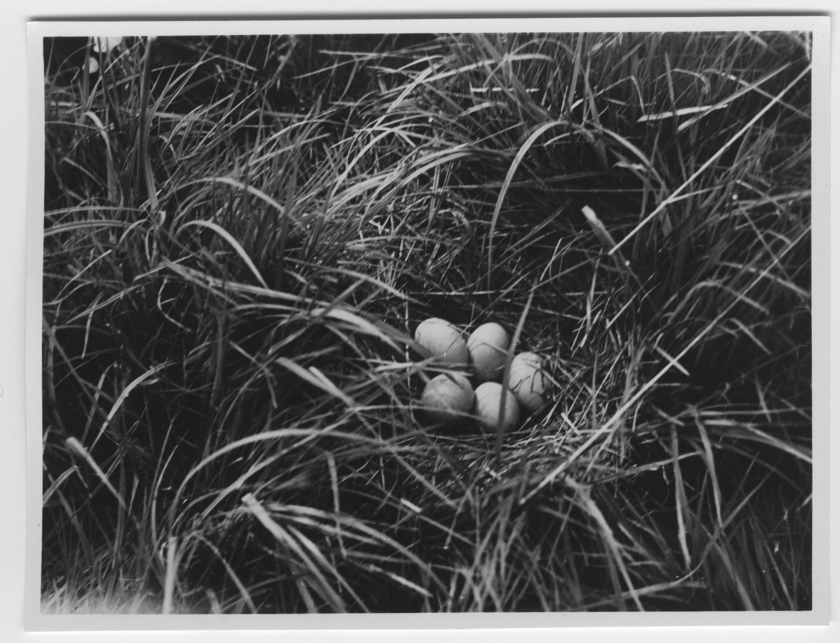 'Bo med 5 st ägg av brunand. Närbild. :: Text på baksidan: ''Brunändernas häckplatser voro i år uppslukade av vattnet, och någon allmän brunandhäckning kunde ej konstateras. Brunandflocken på väl 20 honor och dubbelt så många hanar höll mest till i söder och ibland sågos några viggar i deras sällskap. Ett enda bo fanns, och det var synnerligen typiskt i det att det var slarvigt byggt och ett av dess ägg låg ensamt och övergivet i en tuva 5 m från boet.'' :: :: Ingår i serie med fotonr. 2305-2346.'