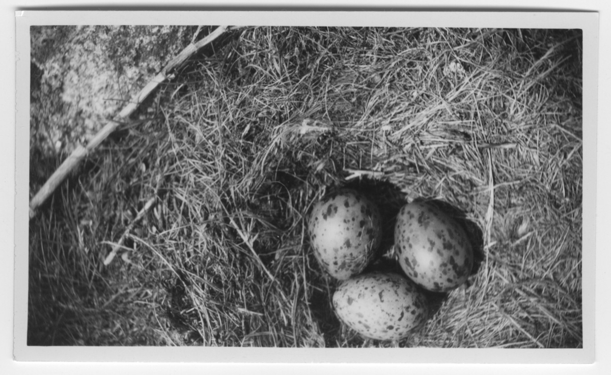 'Bo med 3 st ägg av silltrut. :: :: Text på baksidan av fotot: ''Silltrutens bo med 3 st vackert tecknade ägg.'' :: :: Ingår i serie med fotonr. 4500:1-172.'