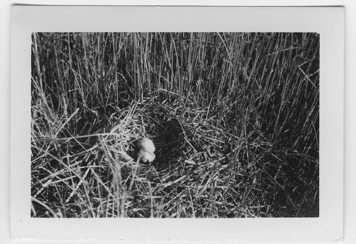 'Bo med 2 st ägg av dvärgmås. :: :: Text på baksidan av fotot: ''Dvärgmåsens bo med 2 st fullruvade ägg, det enda boet i skrattmåskolonin på ca 300 par. Ingengör F. Reuterwall, Varberg, meddelade mig att han sett dvärgmåsen ett par år, men trodde inte att den häckade där. Reden var 40 cm hög och 20 cm i diameter samt bestod av torrt starrgräs.'' :: :: Ingår i serie med fotonr. 4544:1-35.'