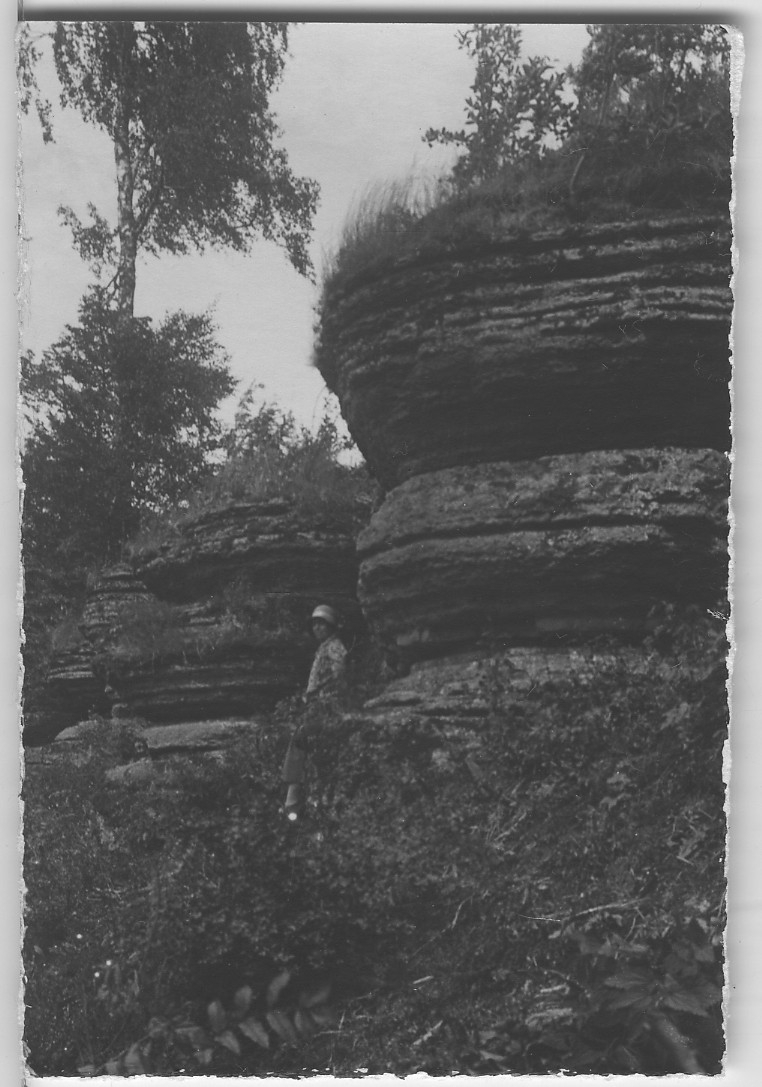 'Diverse foton från sannolikt Kinnekulle. Kalkbrott och naturliga skärningar. :: Vittrad klippa, 1 kvinna stående invid. Samma bild som 4885-4887, 4890. :: :: Serie fotonr 4885-4901.'