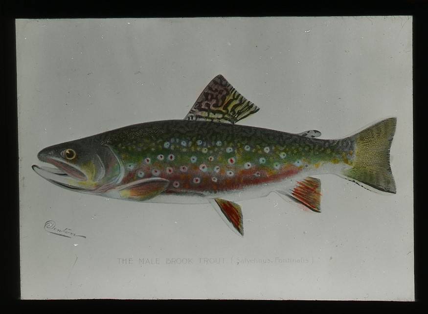 'Illustration av 1 st bäckrödning. Text under bilden: ''The male brook trout. Text på glaset: ''The male'' och ''Department of the interior.'' :: :: :: Ingår i serie med fotonr. 5205:1-20. Se även hela fotonr. 5202-5218 med bilder från Frits Johansen.'