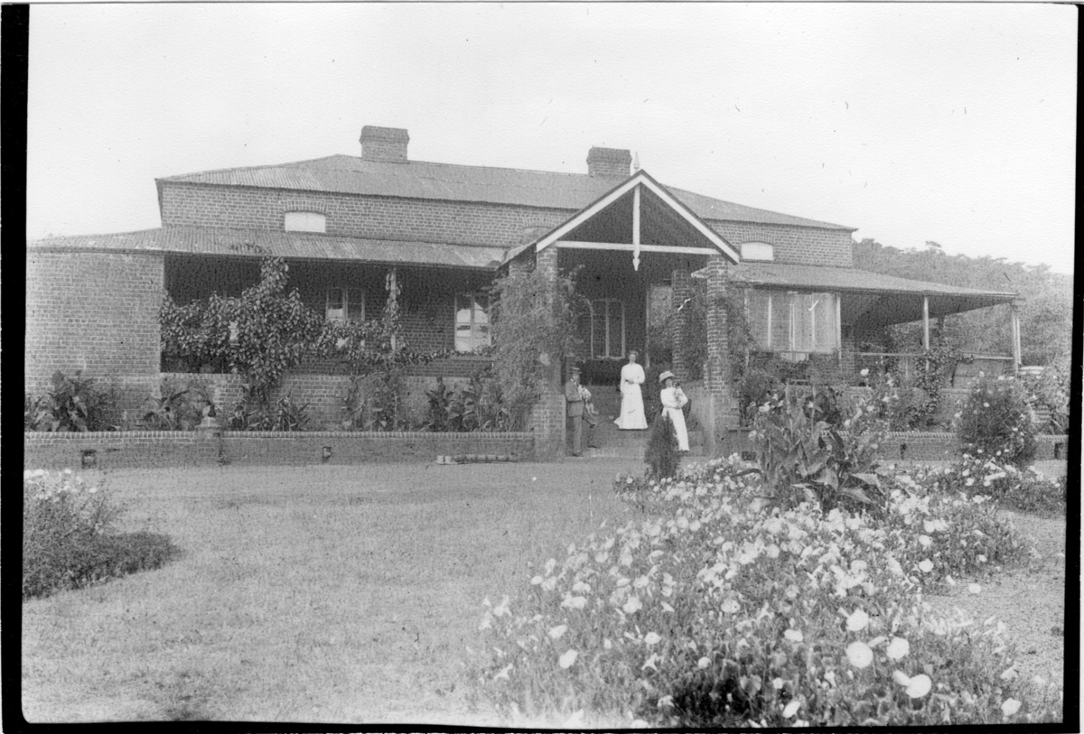 'Diverse fotografier från bl.a. dåvarande Nordrhodesia, nu Zambia, tagna av Konsul Magnus Leijer. :: :: Tegelbyggnad m veranda, planteringar i förgrunden. På trappan till byggnaden står 2 kvinnor o en man. En av kvinnorna o mannen håller en varsin hund.'