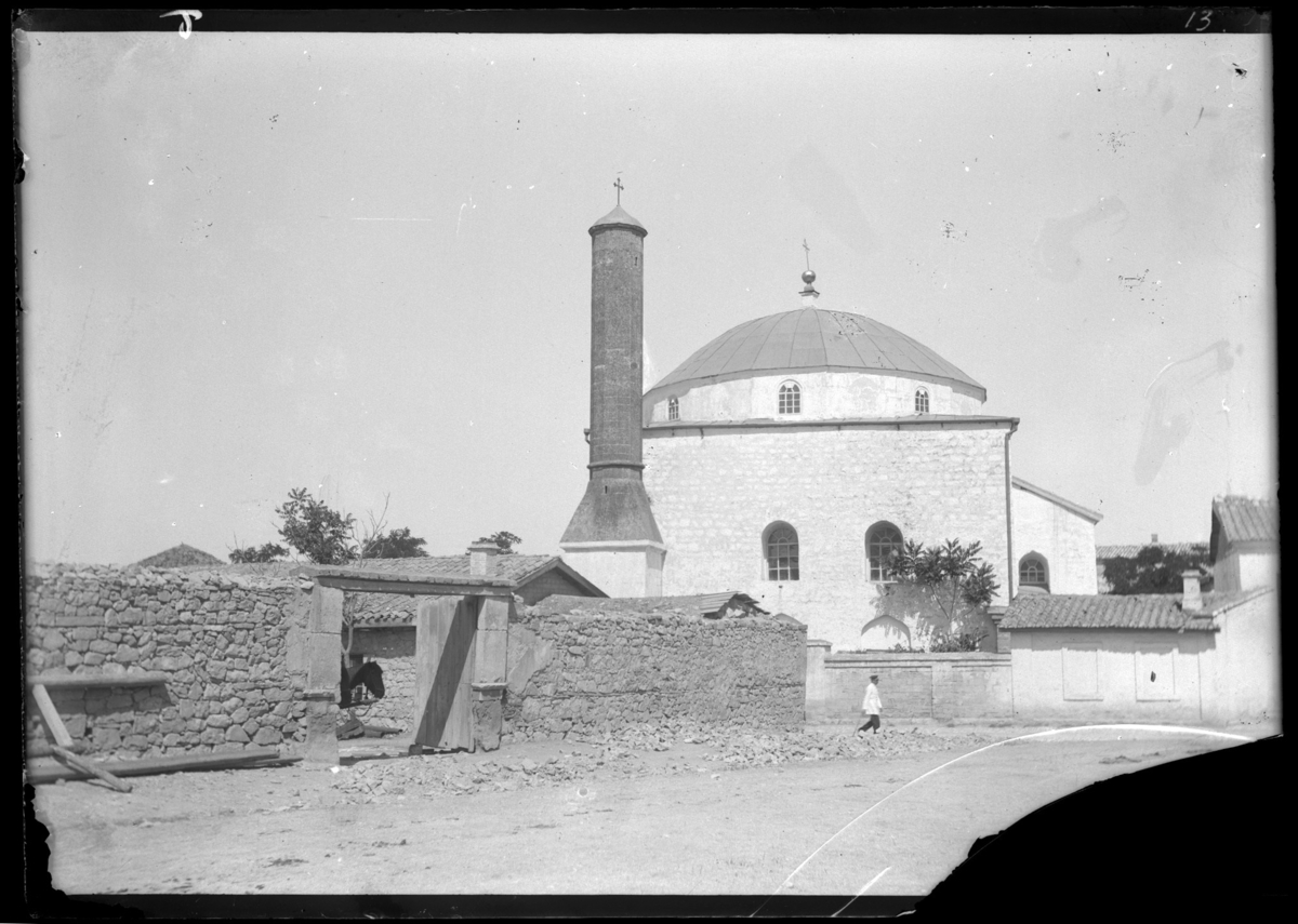 '1 man gående framför en byggnad, kyrka, i förgrunden stenmurar. :: :: Ingår i serie med fotonr. 5283:1-19. Se även fotonr. 5269-5292 med bilder från Stuxbergs resa till Kaukasien.'