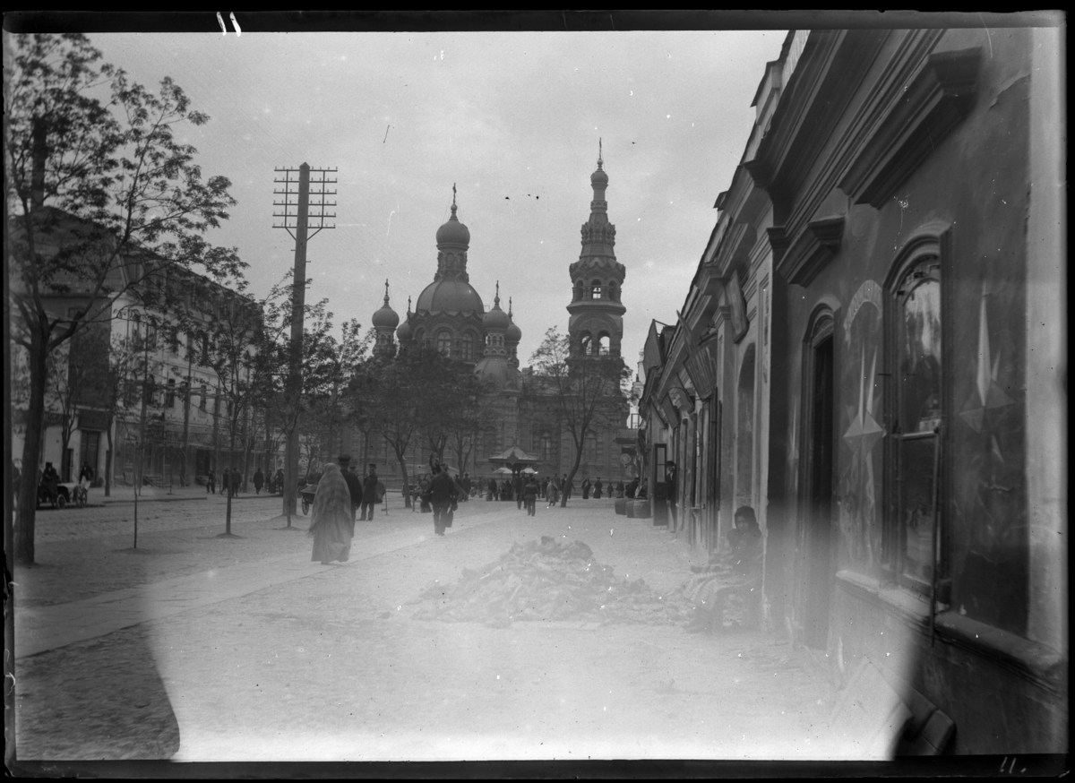 'Gatuvy med promenerande människor, barn, kvinnor, män. I mitten av gatan planterade träd, längs gatan hus. Rakt fram moske med minaret. På gatan hästar med kärra. Elledningsstolpe. Affärer. Kläder. Klädsel. :: :: Ingår i serie med fotonr. 5278:1-21. Se även fotonr. 5269-5292 med bilder från Stuxbergs resa till Kaukasien.'