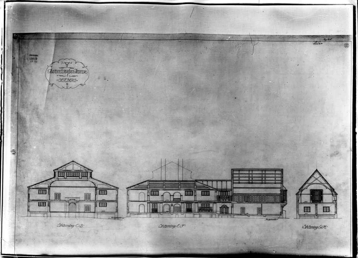 'Exteriör: ''Skärning C:D Skärning E:F Skärning G:H''. :: :: Ingår i serie med fotonr. 6067:1-7 med planritningar, såväl exteriör som interiör, inför nybyggandet av Naturhistoriska Museet i Göteborg.'