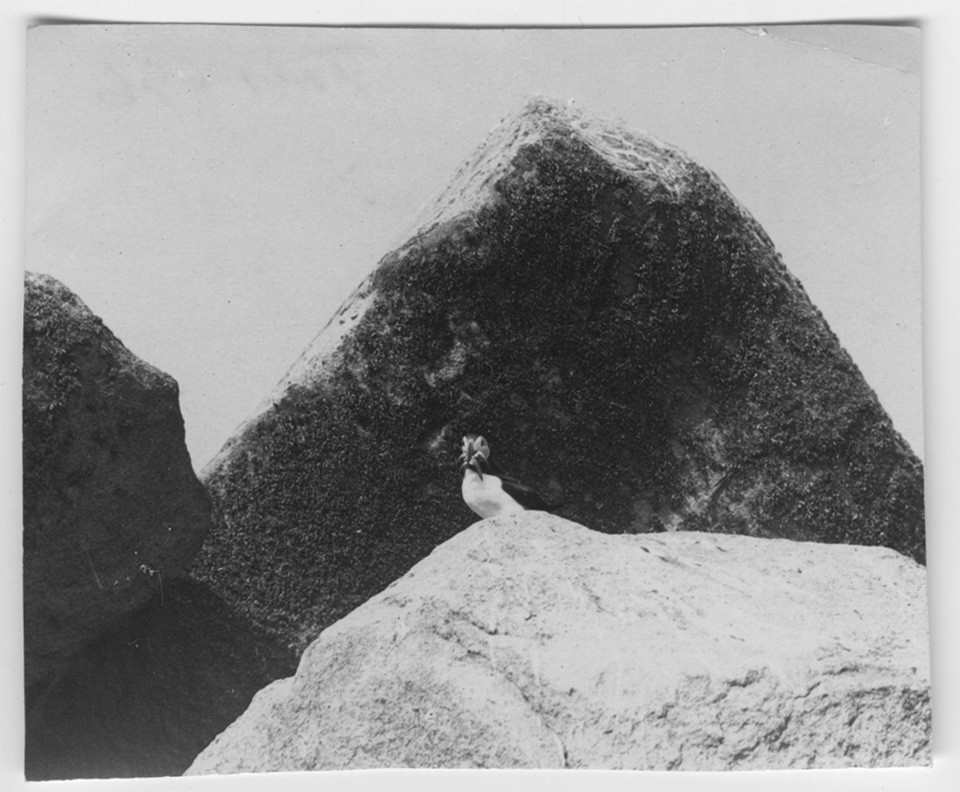 'Lunnefågel. Parti av Soteskär med häckplats. :: Bild över stenblock i förgrunden, skär och hav i bakgrunden. :: :: Ingår i serie med fotonr. 694-697.'