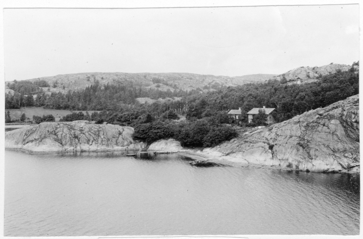 'Vy över Delvid trädbevuxna berg och kala hällar med hus. Brygga invid vattnet. Tillagt med handskriven text under fotot ''Ole Kruse.'' :: :: Fotonr. 7046:1-84 indelade som ''Landskapsbilder från Göteborgs- och Bohus län.'' Ingår i serie med fotonr. 7046:1-383, 7047:1-33 och 7048:1-67 med bilder från Länsjägmästare John Lindners bildarkiv.'
