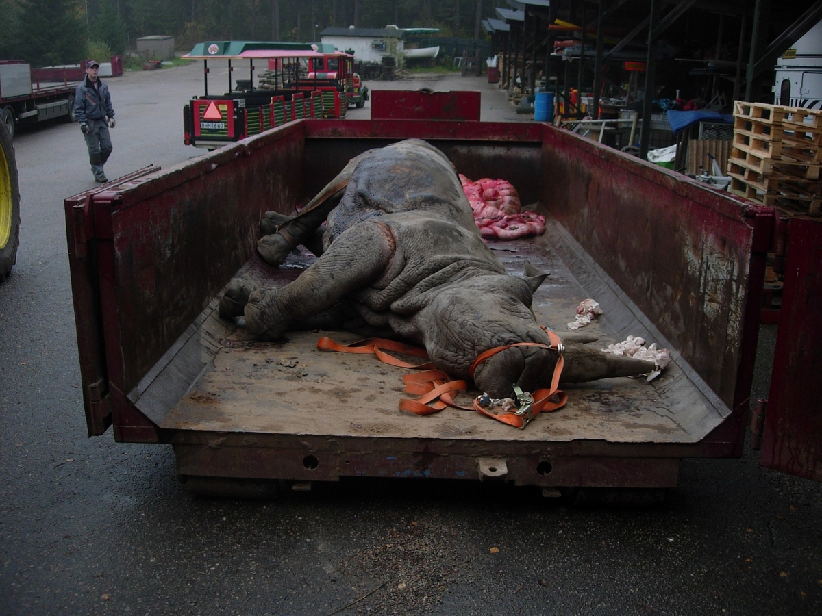 'Vit noshörning med inre organ uttagna, liggande på lastbilsflak. Död i Borås djurpark. :: :: Ingår i serie med fotonr. 7128:1-8.'