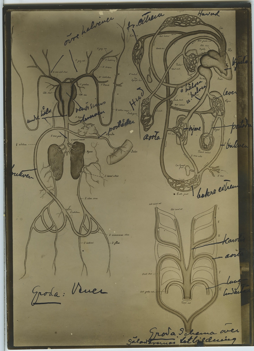 'Teckning av vener och gälar hos groda. Latinska namn på organens delar är utsatta. :: :: ''K.K.'' på baksidan av ett exemplar och ''K. Nyblen'' på ett annat exemplat. Handskrivna bläckanteckningar på ett tredje exemplar. :: :: ''Fotografier använda vid dissektionskursen våren 1928'' . :: Avfotograferade teckningar på skelett och organ. :: På baksidan av vissa står det Kerstin Nyblén :: V.T.-18 :: ur bok'