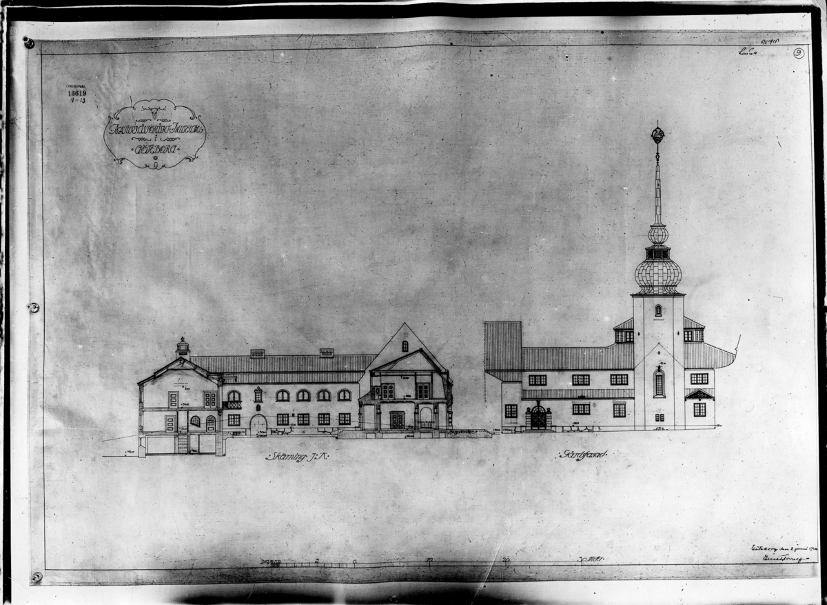 'Exteriör: ''Skärning J:K. Gårdsfasad''. :: :: Ingår i serie med fotonr. 6067:1-7 med planritningar, såväl exteriör som interiör, inför nybyggandet av Naturhistoriska Museet i Göteborg.'