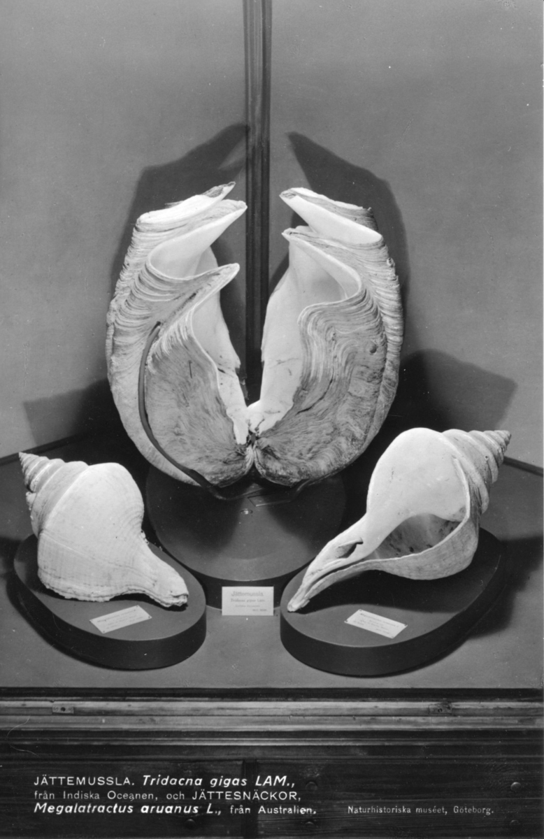'Ingår i en serie med Fotonr. 5419 med Göteborgs Naturhistoriska museums olika vykort genom åren. :: :: En monterad jättemussla från Indiska Oceanen samt 2 monterade jättesnäckor från Australien.'