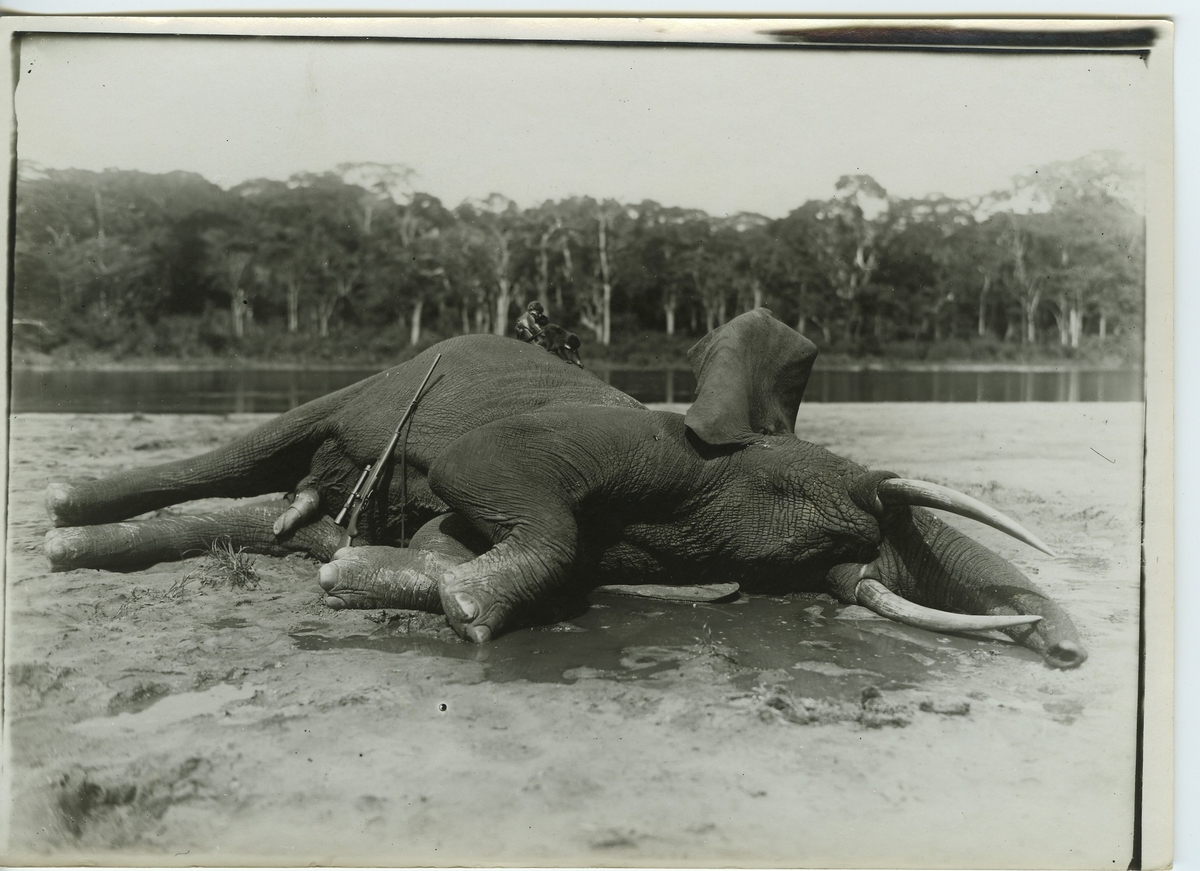 'Elefant, hane. Gevär lutat mot den på sidan liggande kroppen. På ryggen sitter ett par små apliknande djur. :: :: Serie fotonr 983-996'