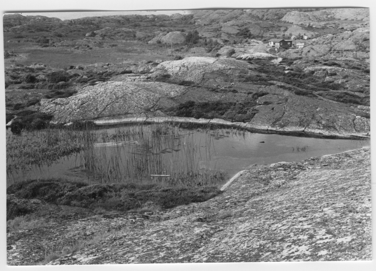 'Bildtext: ''Vattenfyllt klippbäcken i rundhällandskap. Riktning 290.'' Närbild på klippbäcken delvis bevuxet, med berghällar omkring. :: :: Ingår i serie med fotonr. 6970:1-1125, dokumentation av Hisingens naturgeografi, visande landskapsformerna i stora drag och gjord inför exploateringen av området. Platserna för fotograferingen finns utsatta på karta i skala 1:4000 som finns på Göteborgs Naturhistoriska musem. Fotoriktningen mättes med kompass i gammalgrader.'