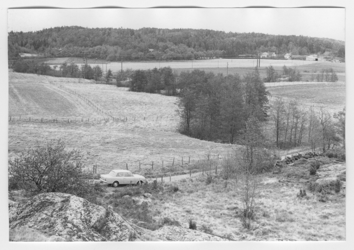 'Bildtext: ''Meandrande bäck med albestånd. Riktning 66.'' Vy över landskap med meandrande vattendrag kantat av alträd. I förgrunden betesmark med stenmura och staket, intill grusväg där 1 bil står parkerad. Del av berghäll synlig i förgrunden. Öppna fält med staket, åkermark. På avstånd hus invid lövträdskogsområde upp mot berget. Stengärdesgård. :: :: Ingår i serie med fotonr. 6970:1-1125, dokumentation av Hisingens naturgeografi, visande landskapsformerna i stora drag och gjord inför exploateringen av området. Platserna för fotograferingen finns utsatta på karta i skala 1:4000 som finns på Göteborgs Naturhistoriska musem. Fotoriktningen mättes med kompass i gammalgrader.'