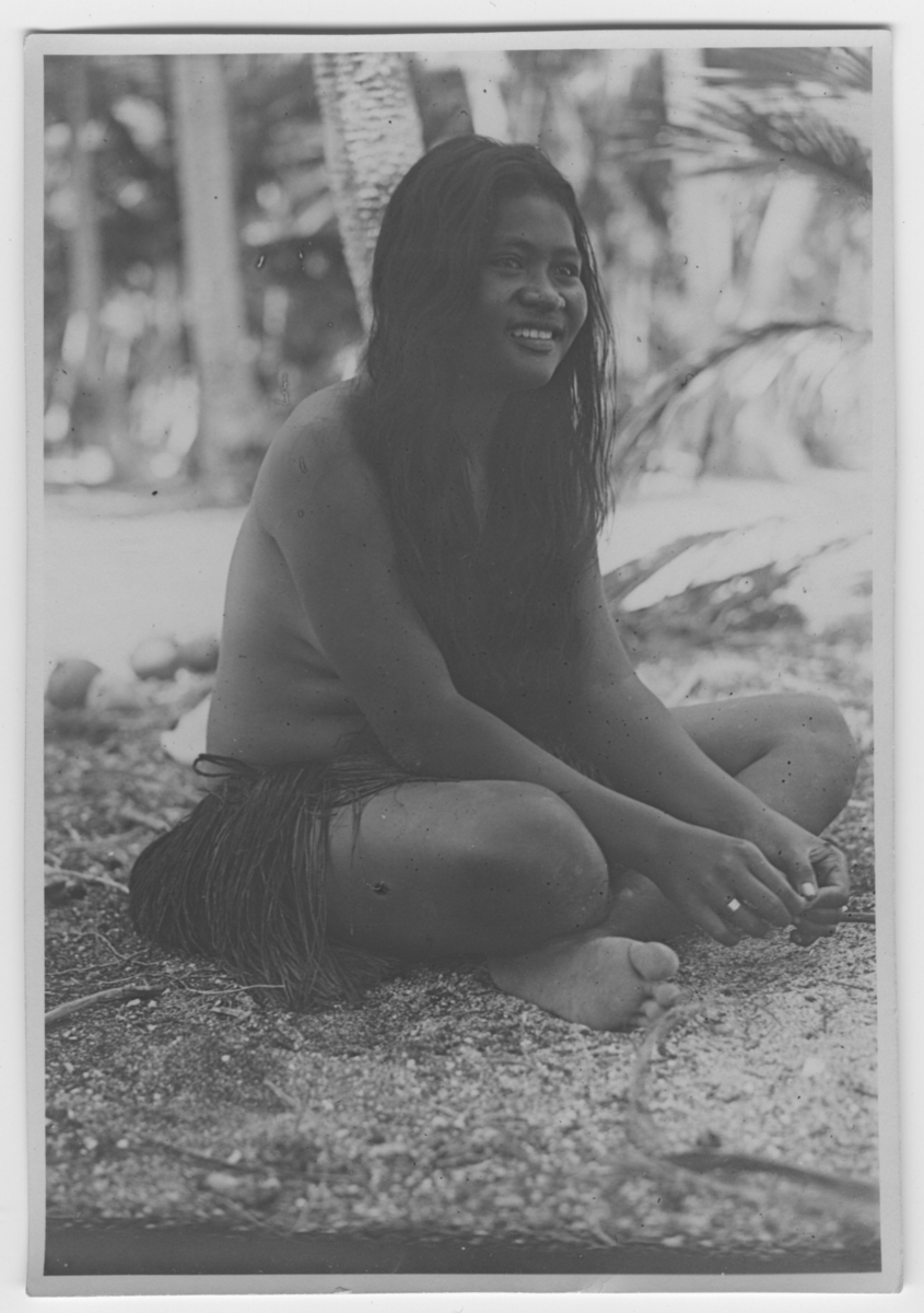 'Bock och Hessle Gilbertöarnaexpeditionen: :: :: 1 ung kvinna sittande på marken, iklädd bastkjol. Text på baksidan: ''Ung hustru''. :: Ingår i serie med fotonr. 6977:1-15.'