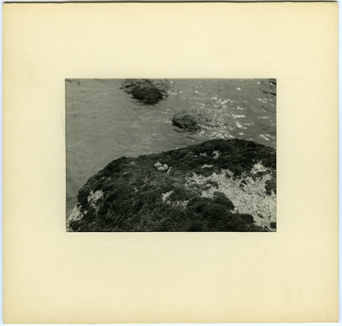 'Bildtext: ''Fisktärnan lägger ej ned mycket arbete på bobygge.'' :: På avstånd bo med 3 ägg av fisktärna, alldeles invid sjöns strand. :: :: Ingår i serie med fotonr. 7083:1-55.'