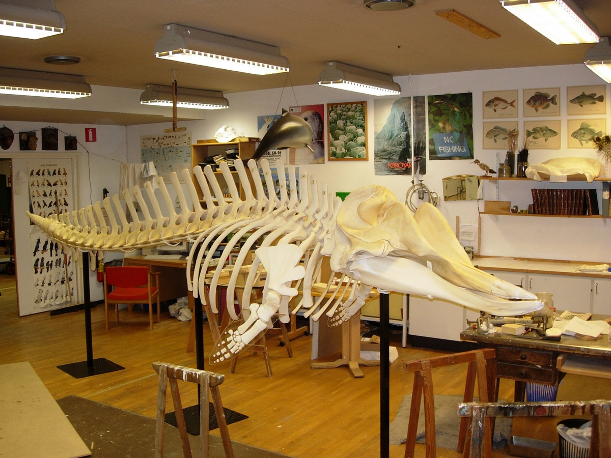 'Monteringsarbetet med näbbvalen, hane, Valders skelett. Skelettet uppställt i ateljén. :: :: Skelettet till näbbvalen är monterat och hänger i valsalen på Göteborgs Naturhistoriska Museum. Då näbbvalen sågs utmed kusten kom den att kallas Valder i media. :: :: Ingår i serie med fotonr. 7106 med bilder på näbbvalen som levande och under arbetet med att montera skelettet.'
