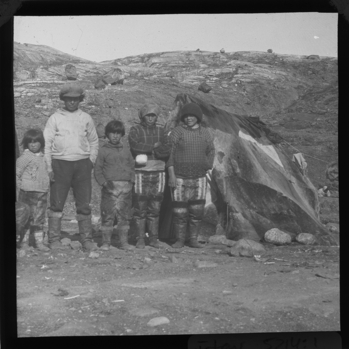 '5 st inuiter (eskimåer) framför tält, kalt berg i bakgrunden. Barn, kvinna och man. Ytterligare 1 person invid högra kanten av tältet. Kläder. Klädsel. :: :: Ingår i serie med fotonr. 5214:1-7. Se även hela fotonr. 5202-5218 med bilder från Frits Johansen.'