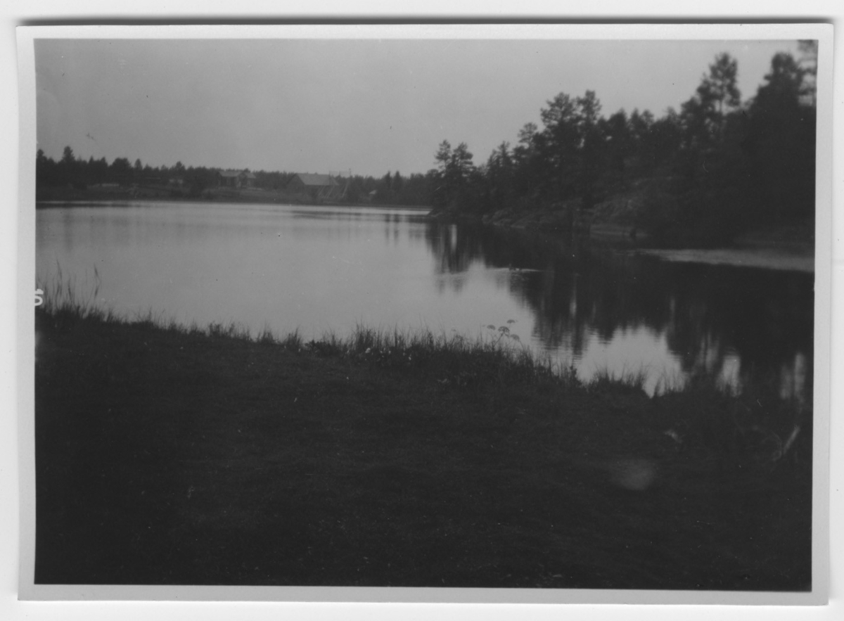 'Smålommar i en skogstjärn, simmande, vy. Gård på andra sidan tjärnen. Berghäll med barrträd. :: :: Se serie med fotonr. 1305-1356.'