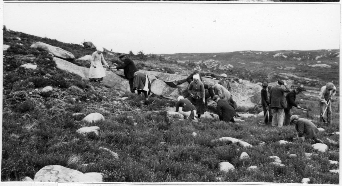 'Bildtext: ''Skogsplantering.'' Vy med en grupp, ca 15 st, kvinnor och män i arbete i skogsplantering på blockig mark. :: :: Fotonr. 7046:307-328 indelade som ''Skogsodling och självsådd.'' Ingår i serie med fotonr. 7046:1-383, 7047:1-33 och 7048:1-67 med bilder från Länsjägmästare John Lindners bildarkiv.'