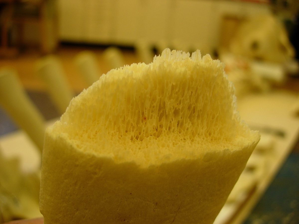'Monteringsarbetet med näbbvalen, hane, Valders skelett. :: Närbild på porerna i avbruten skelettbit. :: :: Skelettet till näbbvalen är monterat och hänger i valsalen på Göteborgs Naturhistoriska Museum. Då näbbvalen sågs utmed kusten kom den att kallas Valder i media. :: :: Ingår i serie med fotonr. 7106 med bilder på näbbvalen som levande och under arbetet med att montera skelettet.'