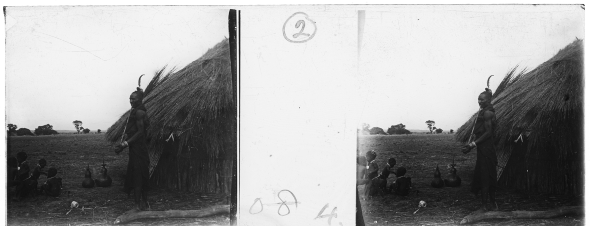 'Mushukulumbwefolket, 1 man står invid en hydda, på marken sitter ca 4 barn. På marken 2 st kalebassliknande behållare och en mugg. Vy med öppen mark med träd på avstånd. :: Enligt text till fotot: ''Mushukulumbwe village headman.'' (Mushukulumbwes byäldste). :: :: Ingår i en serie med fotonr. 5240:1-17. Se även fotonr. 5237:1-16, 5238:1-18 och 5239:1-18.'