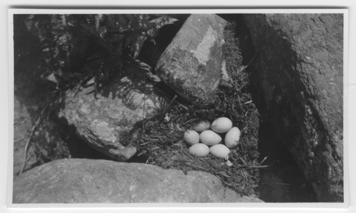 'Bo med 7 ägg, mellan stora stenblock alldeles under falkbo (enligt bildtext). :: :: Ingår i serie med fotonr. 4401-4440.'