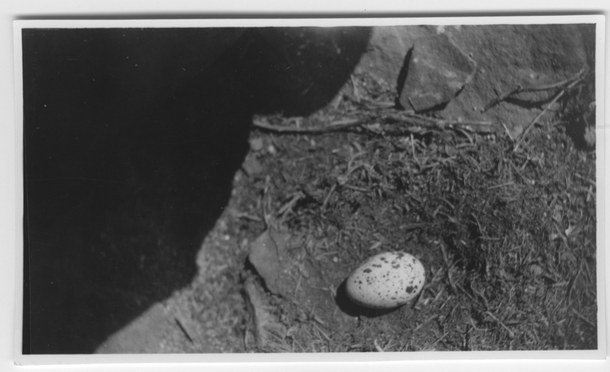 'Bo med 1 ägg. Enligt bildtext: ''Tobisgrisslans ägg ca 8 dagar ? under en sten som borttagits för fotografering. Klas Karlsson meddelade att hans far som pojke fann ''Testens'' ägg under denna sten, således boplats i ca 80 år.'' :: :: Ingår i serie med fotonr. 4401-4440.'