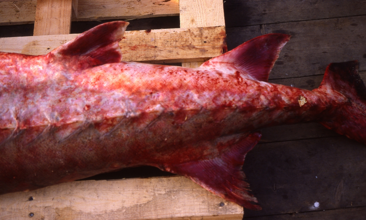 'Stör fångad i Nordsjön: :: :: Närbild på stjärtparti. Stjärtfena. :: :: Ingår i serie med fotonr. 6029:1-12. Se även fotonr. 6028.'