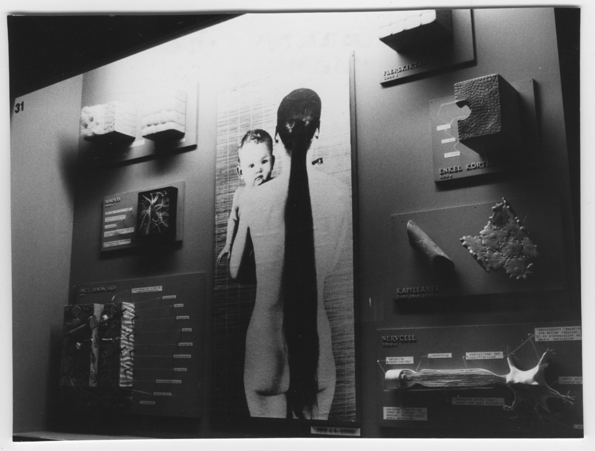 'Utställningsskärm med modeller illustrerande bl.a. ''Enkel körtel'', ''Nervcell'', ''Kapillärer'' och Bindväv'' och foto av kvinna och barn.'
