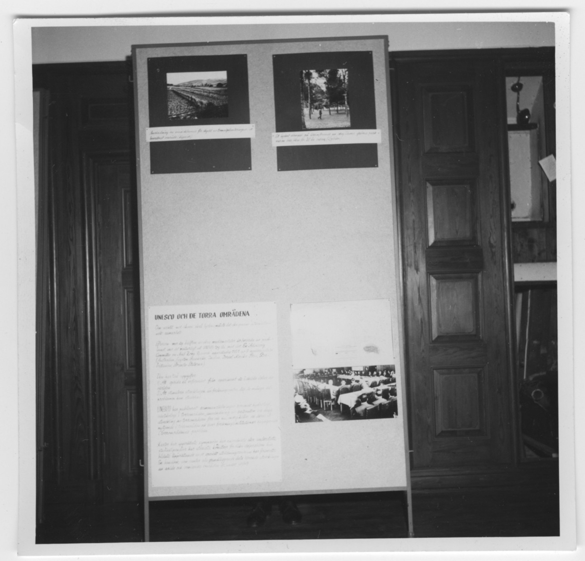 'Utställningsskärm med titel ''Unesco och de torra områdena''. Bilder och texter. Möjligen hör denna ihop med fotonr. 6967:22.'