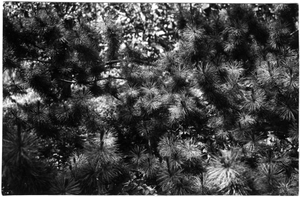 'Bildtext: ''Pinus pumila, 22 år, krypande. Nordamerika'' Närbild på grenar hos Pinus pumila. :: :: Fotonr. 7046:186-212 indelade som ''Utländska träd'' i Göteborgs län och Bohus län''. Ingår i serie med fotonr. 7046:1-383, 7047:1-33 och 7048:1-67 med bilder från Länsjägmästare John Lindners bildarkiv.'