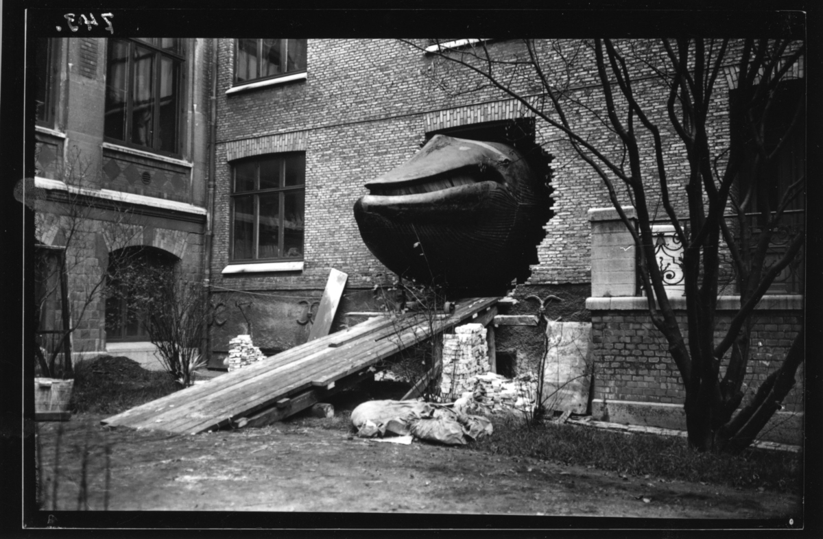 'Zoologiska avdelningens flytt: :: Valhuvudet åker ut genom det förstorade fönstret på gamla museet, Malmska valen :: :: Ingår i serie med fotonr. 743-754.'