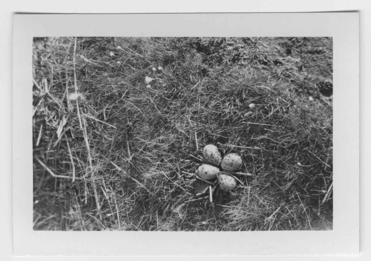 '4 st ägg av skärfläcka i bo. :: :: Text på baksidan av fotot: Skärfläckans bo med 4 st fullruvade ägg på gräsholmen 20 meter öster om Getterön, där enligt uppgift från Ingengör F. Renterwall, Varberg, då redan 4 st kullar av 9 bon kläckts, de äldsta paren, som häckade för år 1947. Den 14 maj 1950. :: :: Ingår i serie med fotonr. 4544:1-35.'