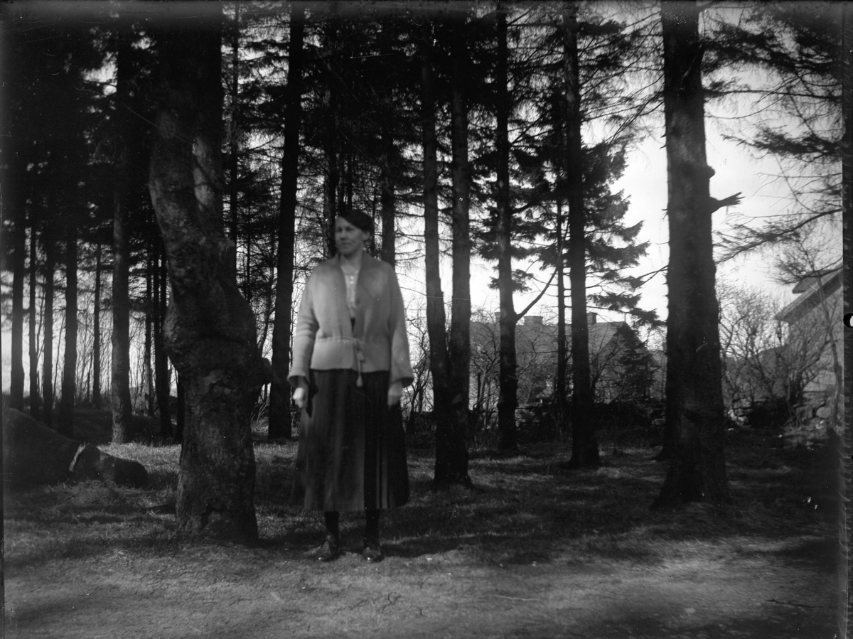 'Bildtext: ''Hulda.'' :: 1 kvinna stpende bland granar, i bakgrunden syns hus. :: :: Ingår i serie med fotnr. 5224:1-13.'