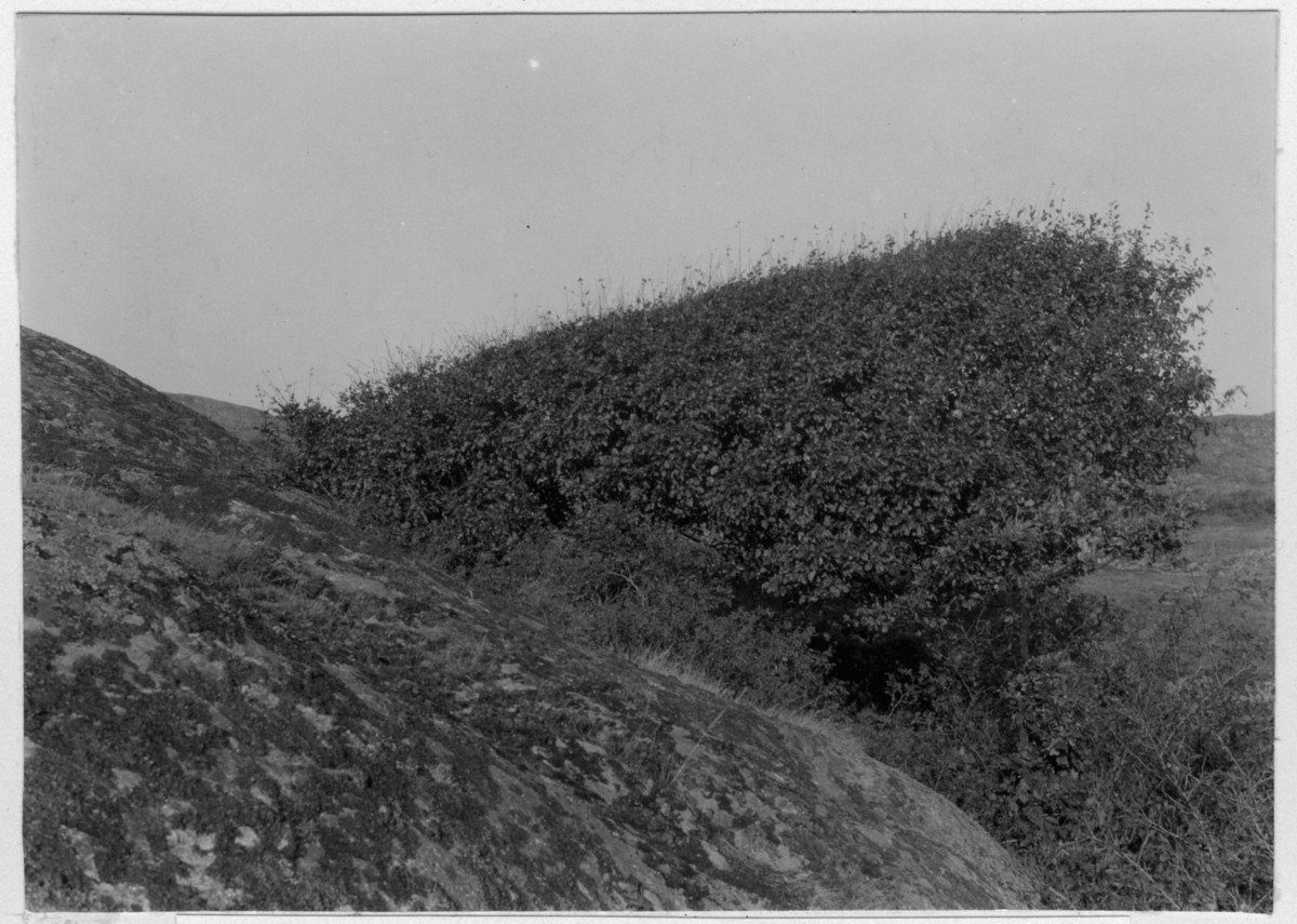 'Bildtext: ''Vindpinad hagtorn, ett enda träd, roten och stammen längst till vänster.'' Närbild på växtsätt hos vindpåverkad hagtorn växande ut från bergvägg. :: :: Fotonr. 7047:2-23 indelad under rubriken ''Atmosfäriska skador på skogen, skogseld och släckning därav.'' Ingår i serie med fotonr. 7046:1-383, 7047:1-33 och 7048:1-67 med bilder från Länsjägmästare John Lindners bildarkiv.'