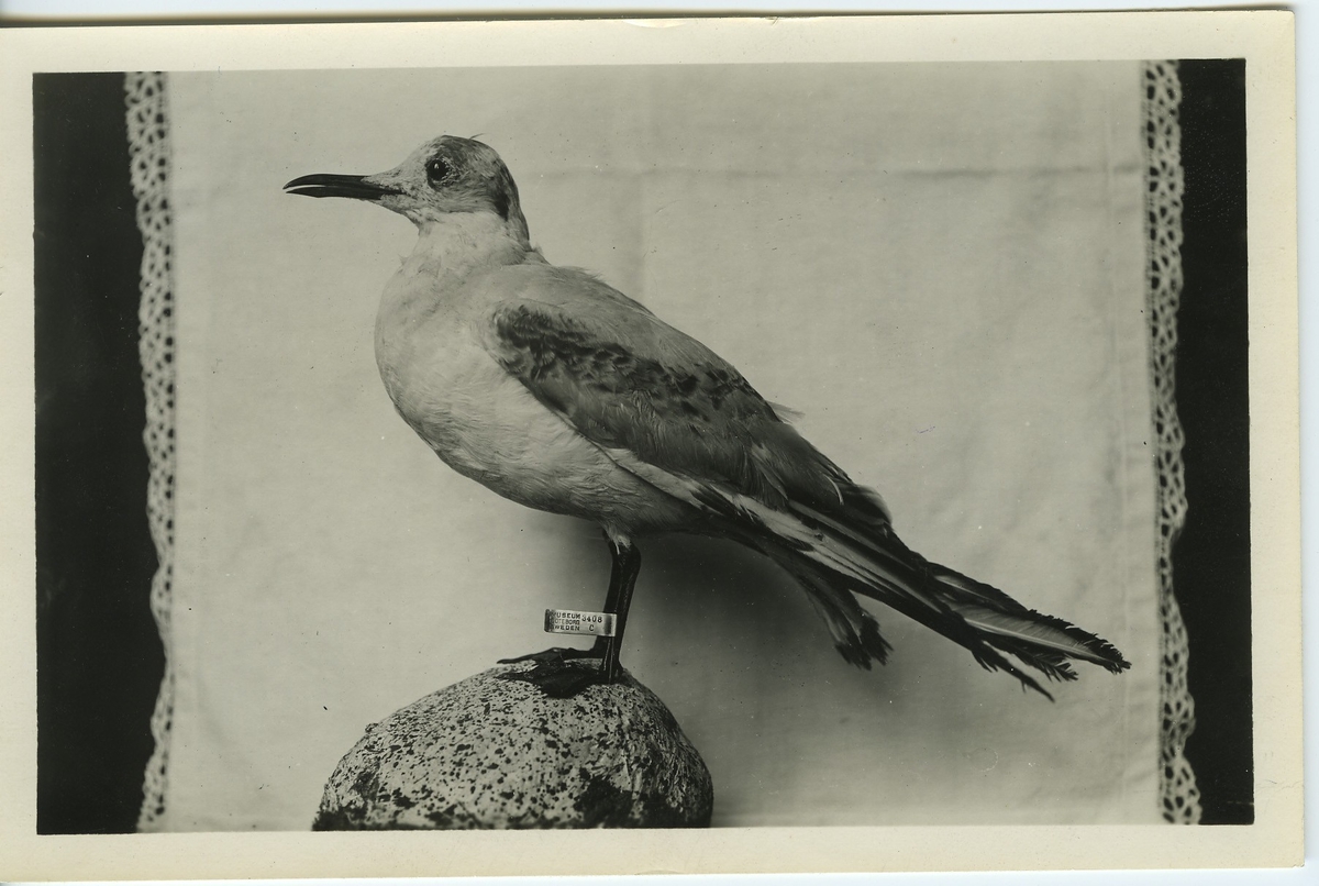 'Skrattmås, ringmärkt. Fågel i helfigur. ''Museum, Göteborg, Sweden nr.3408 C''. Ringmärkt vid Måkläppen 1925-07-01, återfunnen 1926-03-21 vid Rho i kommunen Buccinasco prov. Milano, italien. :: :: Stämpel på baksidan ''Medico veterinario consorziale, Bellotti Dott. Cav. Uff. Pilade. RHD'' :: :: Se även fotonr. 1024.'