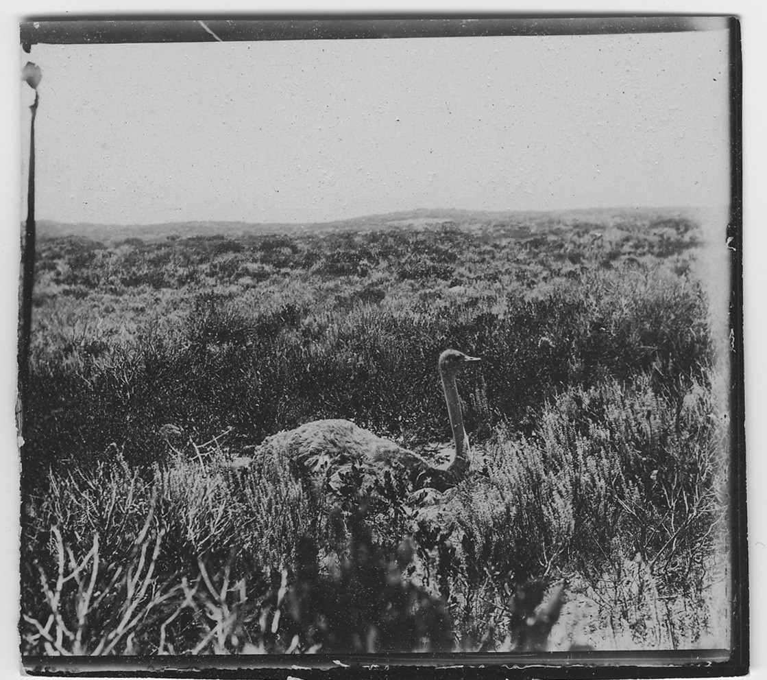 'Strutsfågel på bo, gräs och buskvegetation. ''Strutshona på redet'' enligt artikel. :: :: Ingår i serie med fotonr.167-179, 181-184, 186-191, 193-196, 198-203 samt 205-215 med foton från Hilmer Skoogs expedition till Sydafrika år 1912-1913.'