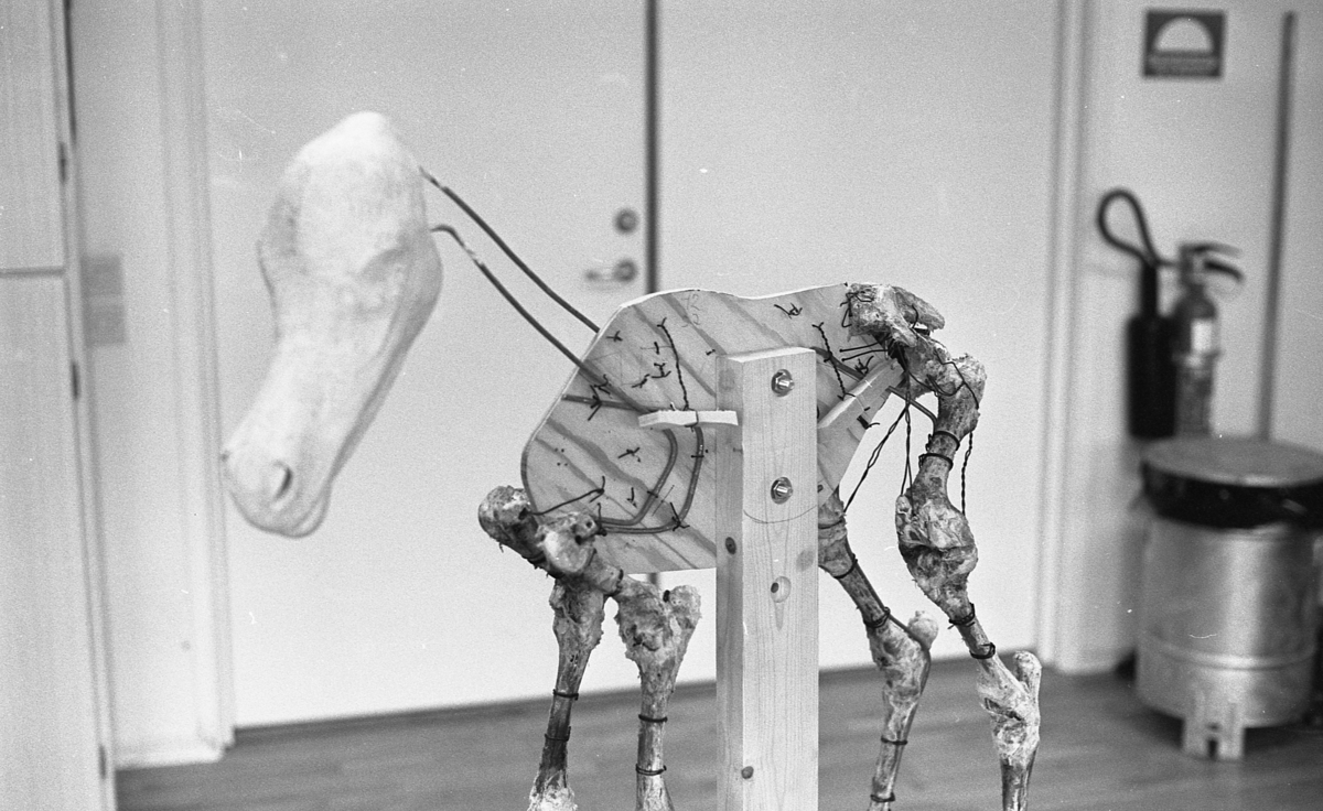 'Montering av föl: :: Fölmontaget under arbete, närbild på avgjutna huvudet fastsatt på grundstommen med centralbräda med extremitetben. :: :: Fölet fött 1982-07-25, död 1982-07-26 i Slottsskogen. Montaget utfört av Jeanette Setterberg finns utställt i däggdjurssalen i monterskåp nr 62 (2007-01-14). :: :: Coll.an. 14334. :: :: Ingår i serie med fotonr. 5814.'