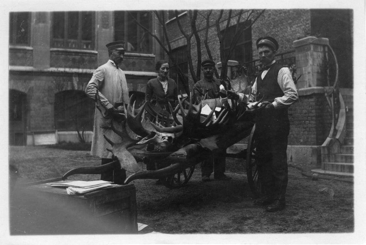 'Zoologiska avdelningens flytt: :: :: Diverse älghorn flyttas. 3 män och 1 kvinna stående vid älghornet, utanför Ostindiska huset. Med på bilden Anders? Svensson, S.Olander, E.Ljungblads far., Sally Benedikta Olander/Ohlander :: :: Se fotonr. 755-756.'
