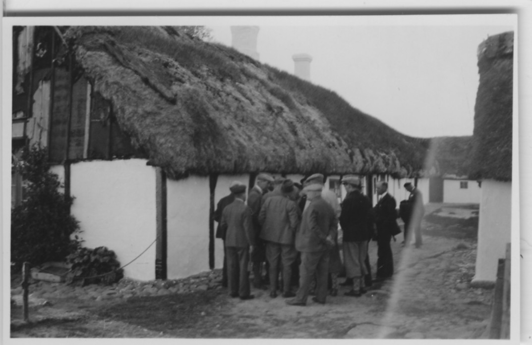'Biologiska föreningens utfärd till Läsö och Nordre Rönner: :: :: ''Bangsbo gård'', drygt 10 st män i en grupp stående på innergården till gårdsbyggnaden med halmtak. :: :: Se fotonr. 2674-2734, 2687-2691, 2692-2711, 2714-2734, 2843-2863 och 2975 från samma utfärd.'