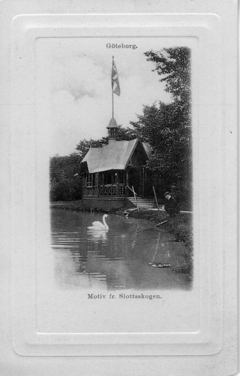 '''Choklad-villan''. Text på baksidan av kortet: ''''Cloetta-villan. Tidigare uppsatt vid Stora Dammen och ... Till restaurang.'' Träbyggnad vid sjö i Slottskogen.'