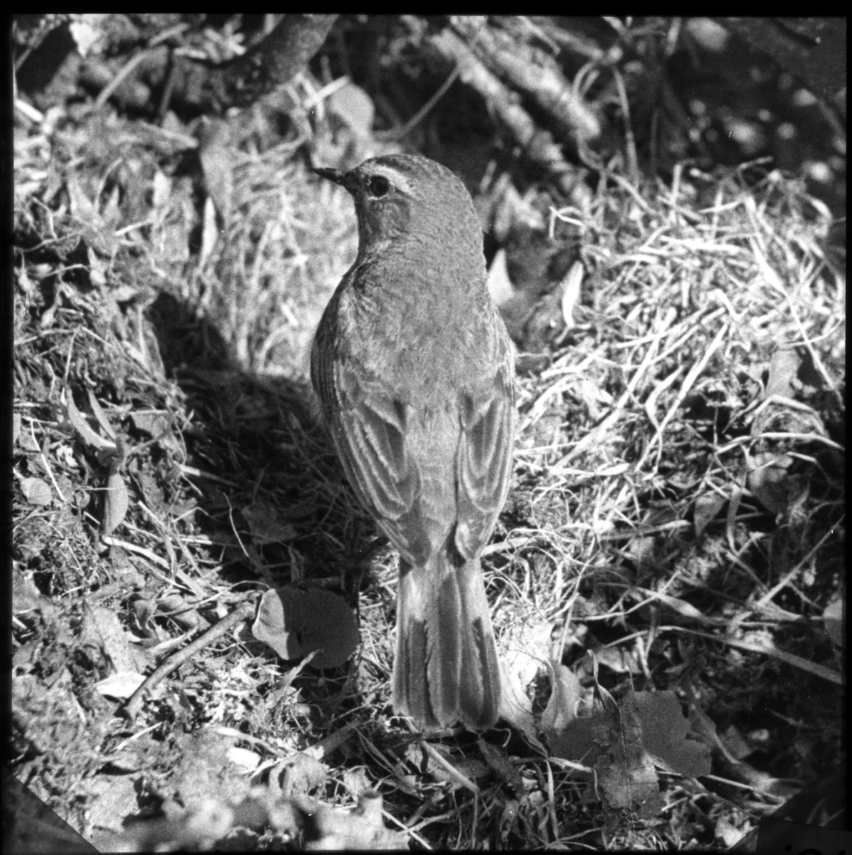 'Bildtext: ''Blåhake, hane, vid bokanten.'' Blåhake vid boet med ungar, fågeln sedd bakifrån. :: :: Ingår i serie med fotonr. 5156:1-10 numrerade med bildnr 110-119. Se även hela serien med fotonr. 5155-5174.'