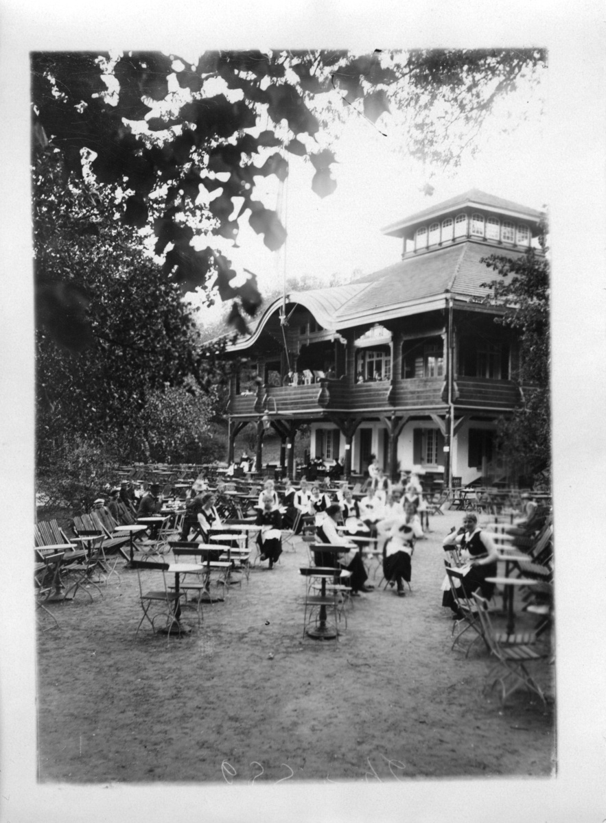 Björngårdsvillan (brann ned 1951), bild med bord på planen utanför. Folkdräktsklädda? människor sitter vid små runda borden framför Björngårdsvillan.