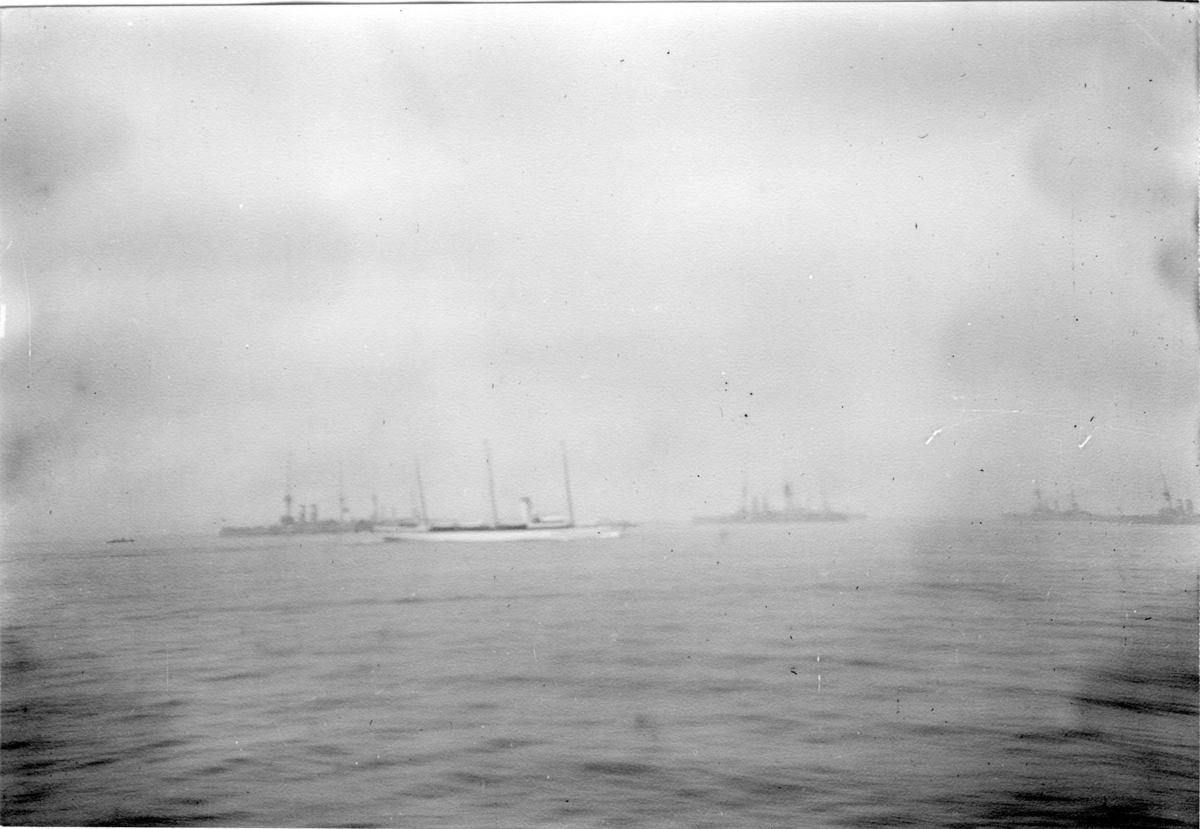 'Diverse fotografier från bl.a. dåvarande Nordrhodesia, nu Zambia, tagna av Konsul Magnus Leijer. :: :: Vy över stort vatten med ett flertal större båtar, fotograferade från avstånd.'
