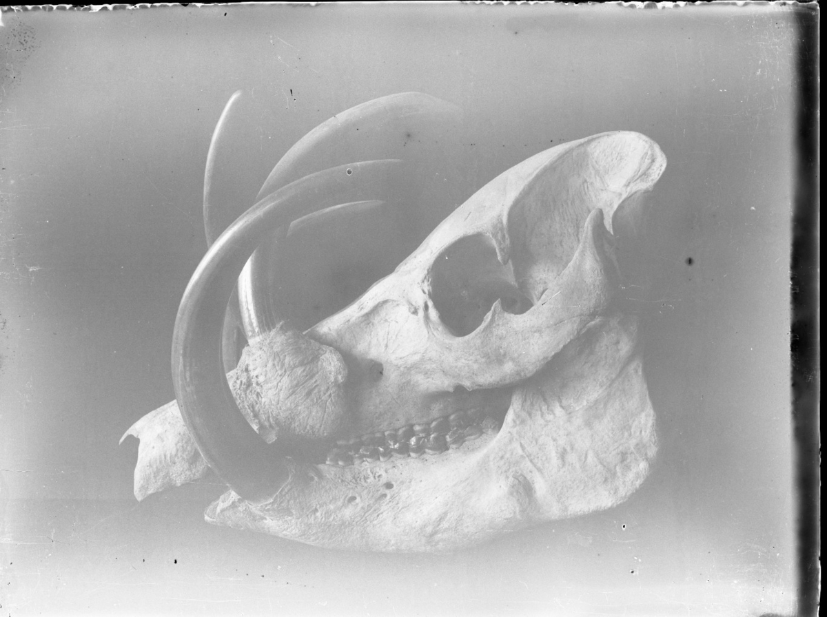 'Närbild på kranium av hjortsvin, sett från sidan, med 4 betar. :: :: Ingår i serie med fotonr. 5127:1-7.'