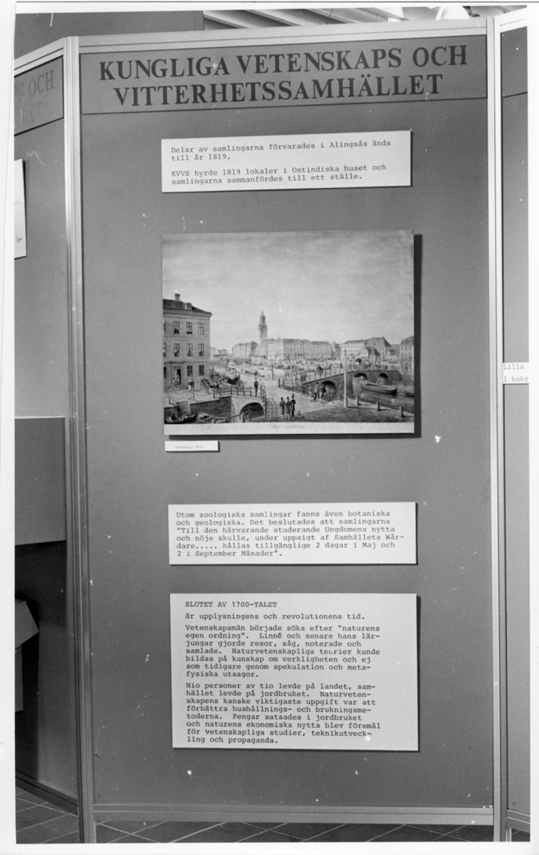 'Foto på Jubileumsutställningen, Göteborgs Naturhistoriska museum 150 år. :: :: Skärm som belyser det vetenskapliga klimatet under 1700-talet samt var samlingarna då var lokaliserade (Alingsås fram tom 1819, sedan Ostindiska huset i Göteborg).'