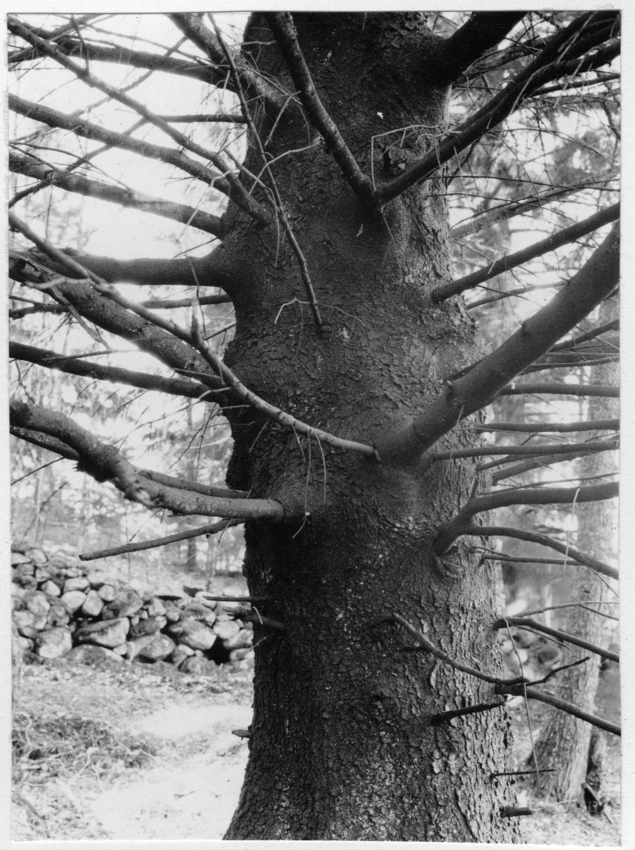 'Bildtext: ''Grovgrenig gran.'' Detaljbild av granstam med rikligt antal grenar. I bakgrunden stenmur. :: :: Fotonr. 7046:293-306 indelade som ''Skogsmarken. Trädens byggnad och livsföreteelser.''. Ingår i serie med fotonr. 7046:1-383, 7047:1-33 och 7048:1-67 med bilder från Länsjägmästare John Lindners bildarkiv.'
