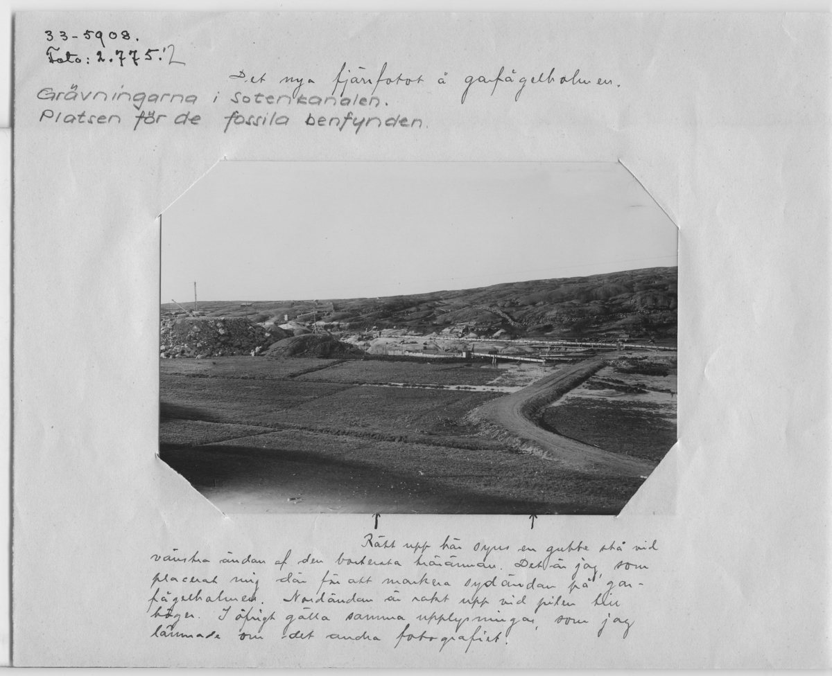 'Från grävningarna i Sotenkanalen: platsen för de fossila benfynden. Vy, ''Det nya fjärrfotot å garfågelholmen''. :: :: Vy över grävplatsen med nänniskor och maskiner, redskap på avstånd. Cyklar ligger ner läng vägen. :: Bildtext: ''Det nya fjärrfotot å garfågelholmen.'' Pil pekar ''Rätt upp här syns en gubbe stå vid vänstra änden av den bortersta trärännan. Det är jag, som placerat mig där för att markera sydändan av garfågelholmen. Nordändan är rakt upp vid pilen till höger. I övrigt gälla samma upplysningar, som jag lämnade om det andra fotografiet.'' :: :: Serie fotonr 2773-2778, bilderna är monterade på papper som har utförlig text. Liknande motiv som fotonr. 2776.'