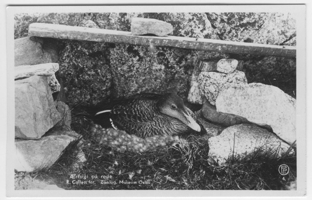 'Ejder på boet med dunkrans synlig. Boet invid stnblock, bräda liggande ovanför. Närbild. :: :: Ingår i serie med fotonr. 3415-3418.'